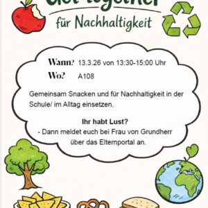 - „Natürlich engagiert“ lädt ein zum „Get Together“Am 13. März 2026 von 13.30 Uhr – 15.00 Uhr treffen wir uns in A108, und wir vom Wahlkurs stellen kurz einige Projekte zum Thema Nachhaltigkeit an unserer Schule vor.Anschließend… „Natürlich engagiert“ lädt ein zum „Get Together“ weiterlesen