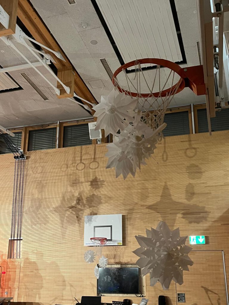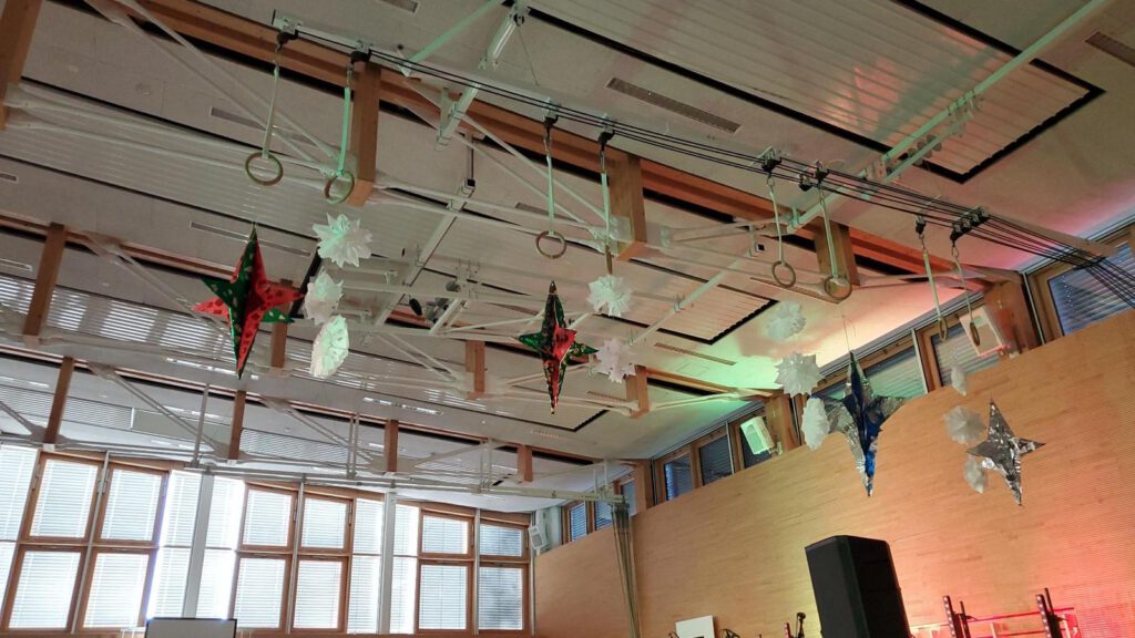 Das Technikteam unterstützte bewährt und zuverlässig die Fachschaft Musik, sorgte für den guten Ton und tauchte die Turnhalle in angenehmes Licht. So konnten die Sterne, die der Wahlkurs Schulhausgestaltung zu diesem Anlass gefertigt hatte, besonders schön glänzen.