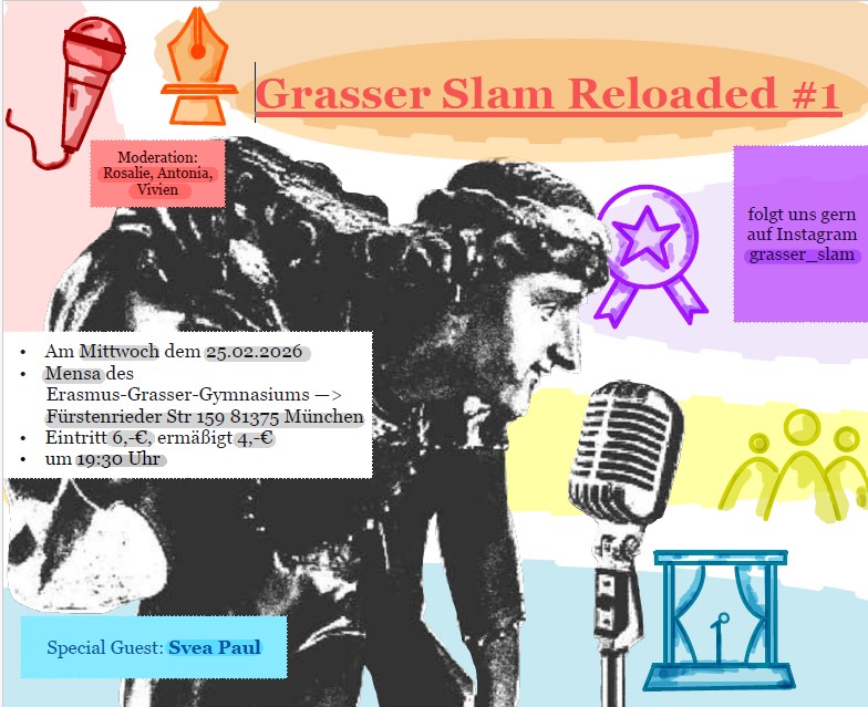 Der Grasser Slam kehrt als Grasser Slam Reloaded #1 aus der Pause zurück und findet am Mittwoch, 25.02.2026 ab 19:30 Uhr in der Mensa statt (Eintritt 6 € / ermäßigt 4 €).