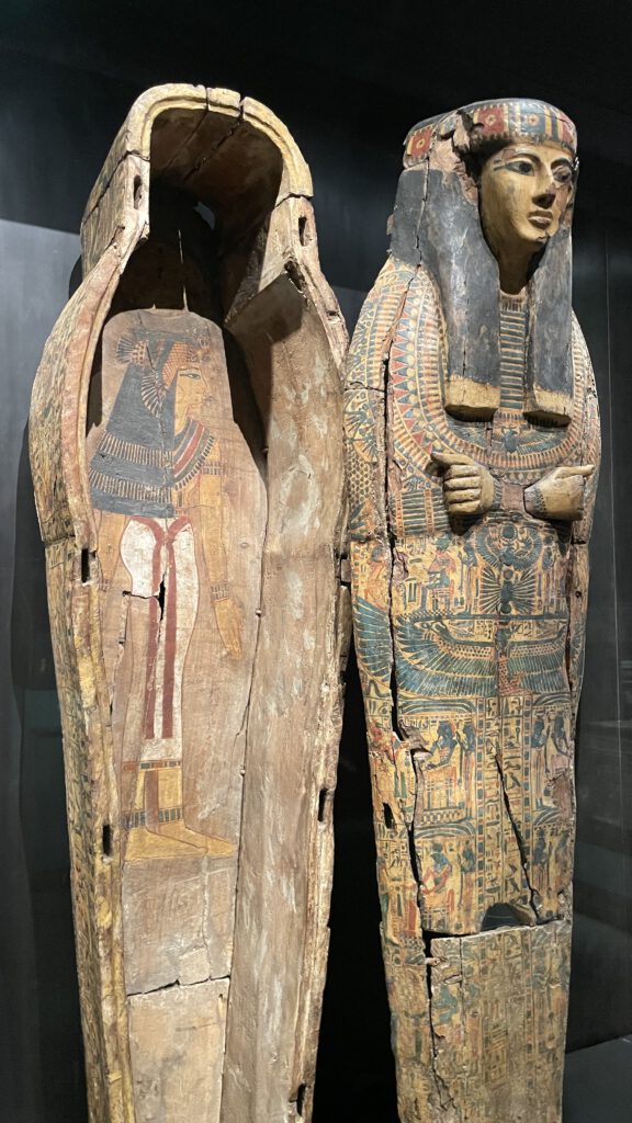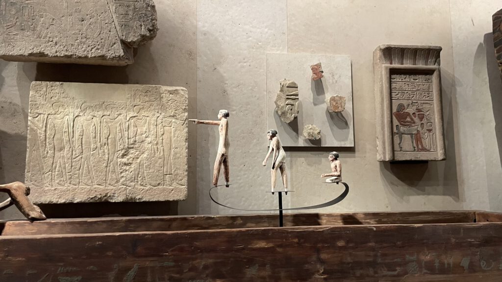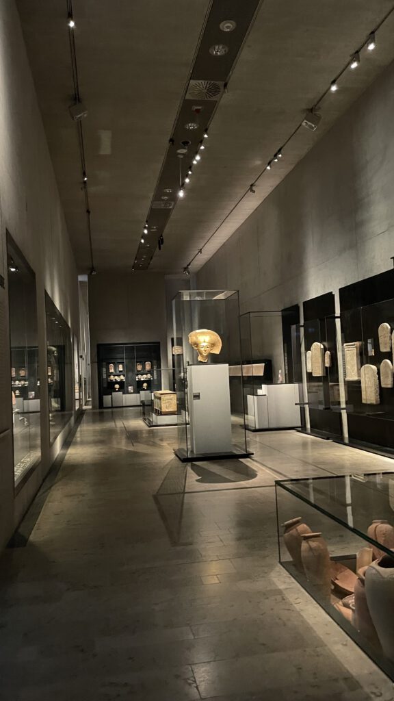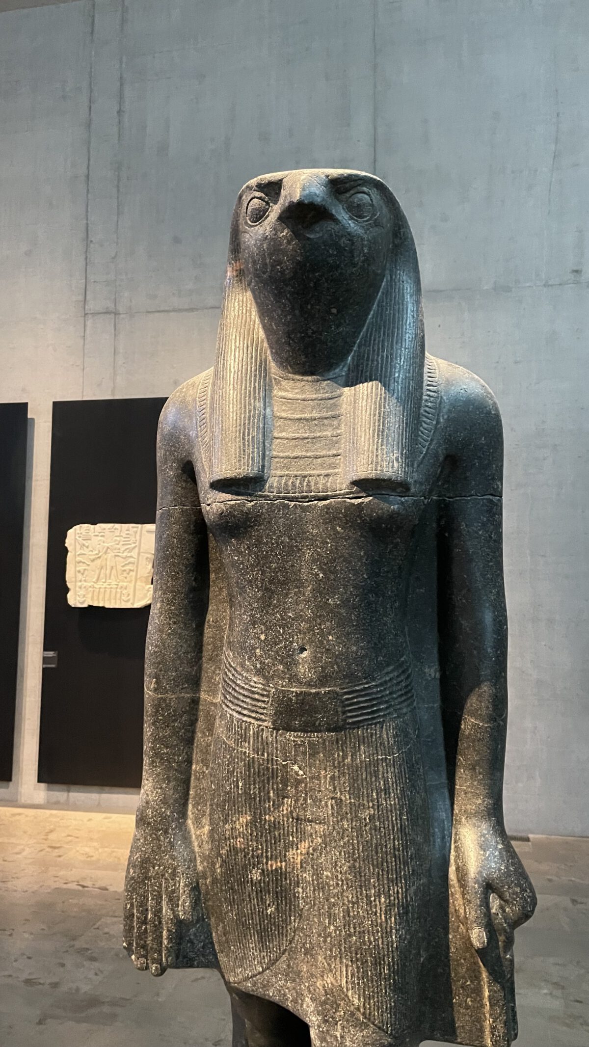 Dann ging’s los! Im spektakulären unterirdischen Bau des Museums wurden wir zu einigen der bedeutsamen Kunstwerke geführt, die uns aus dem alten Ägypten überliefert sind: Von der Standfigur eines falkenköpfigen Gottes über die Doppelstatue eines Pharaos bis hin zum überdimensionalen Oberteil des Sarges einer Königsschwester, weithin sichtbar durch seine golden leuchtende Oberfläche, vorbei an monumentalen Obelisken, dem neun Meter langen Totenbuch aus Papyrus und der Scheintür aus Kalkstein, die über den Jenseitsglauben der alten Ägypter Aufschluss gibt.