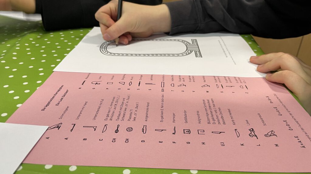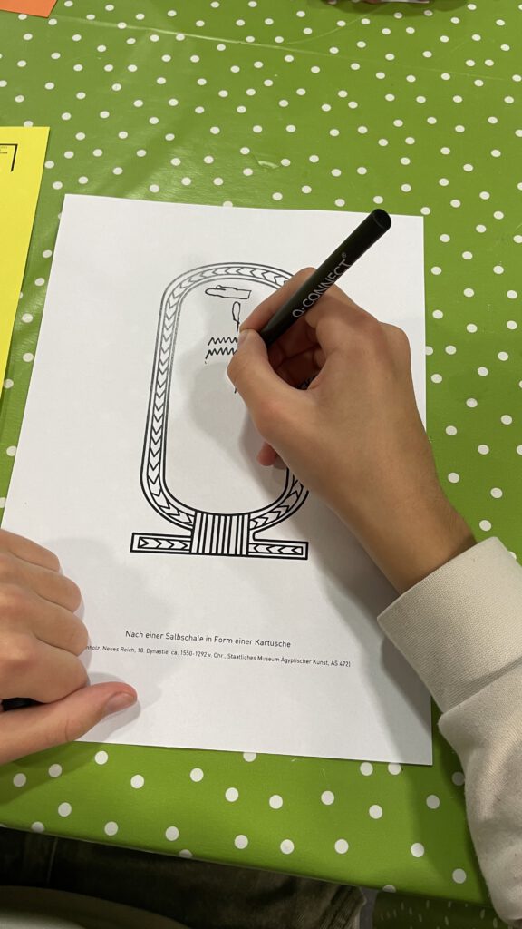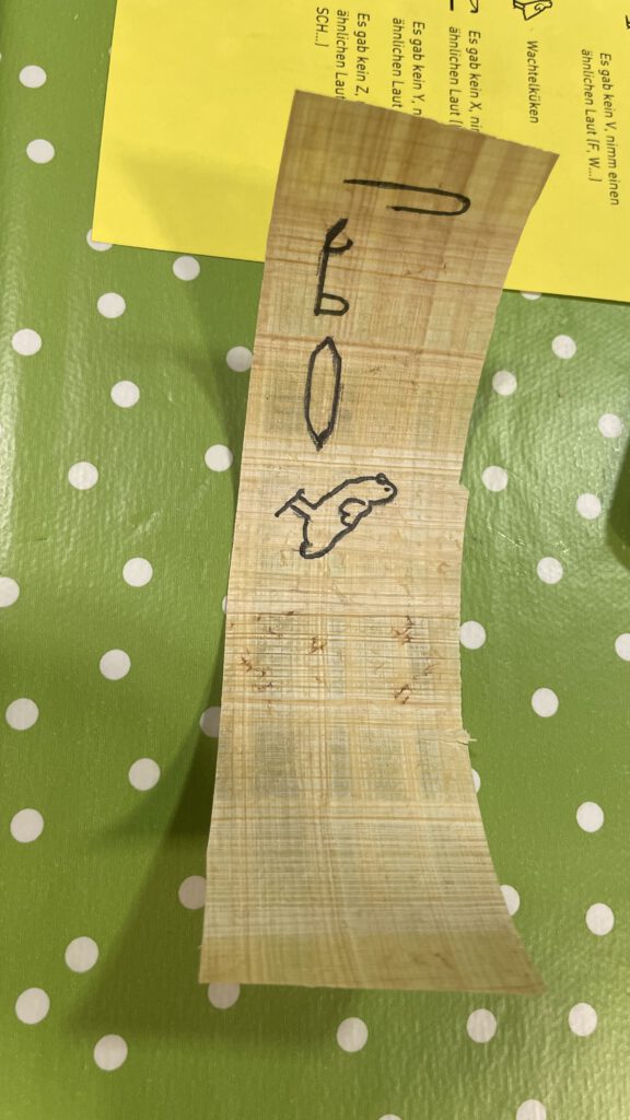 Ein ägyptisches Federmäppchen Dieses und vieles mehr wurde uns fachkundig von zwei engagierten Referentinnen des Museums erklärt. Die Schülerinnen und Schüler lauschten interessiert den Geschichten über Mumifizierung und Ernährung, über religiöse Vorstellungen und über die Herrschaft der Pharaonen. Im Anschluss an die Führung wurde die Klasse, brotzeitgestärkt, in einem Werkstattprogramm in die geheimnisvolle Welt der Hieroglyphen eingeführt und durfte nun selbst die ägyptische Schriftkunst auf echtem Papyrus ausprobieren. Ein gelungener Abschluss dieses Vormittags, der allen sichtlich gut gefallen hat.